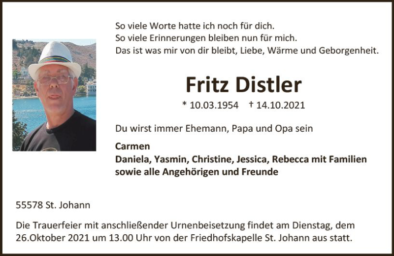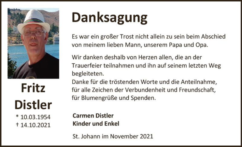 Hier finden Sie alle Traueranzeigen aus der Zeitung, die bisher für Fritz Distler erschienen sind. Weitere Traueranzeigen, die in der Zeitung erscheinen, werden hier ebenfalls aufgelistet