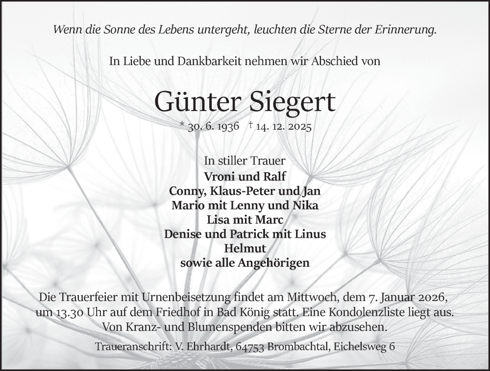 Hier finden Sie alle Traueranzeigen aus der Zeitung, die bisher für Günter Siegert erschienen sind. Weitere Traueranzeigen, die in der Zeitung erscheinen, werden hier ebenfalls aufgelistet
